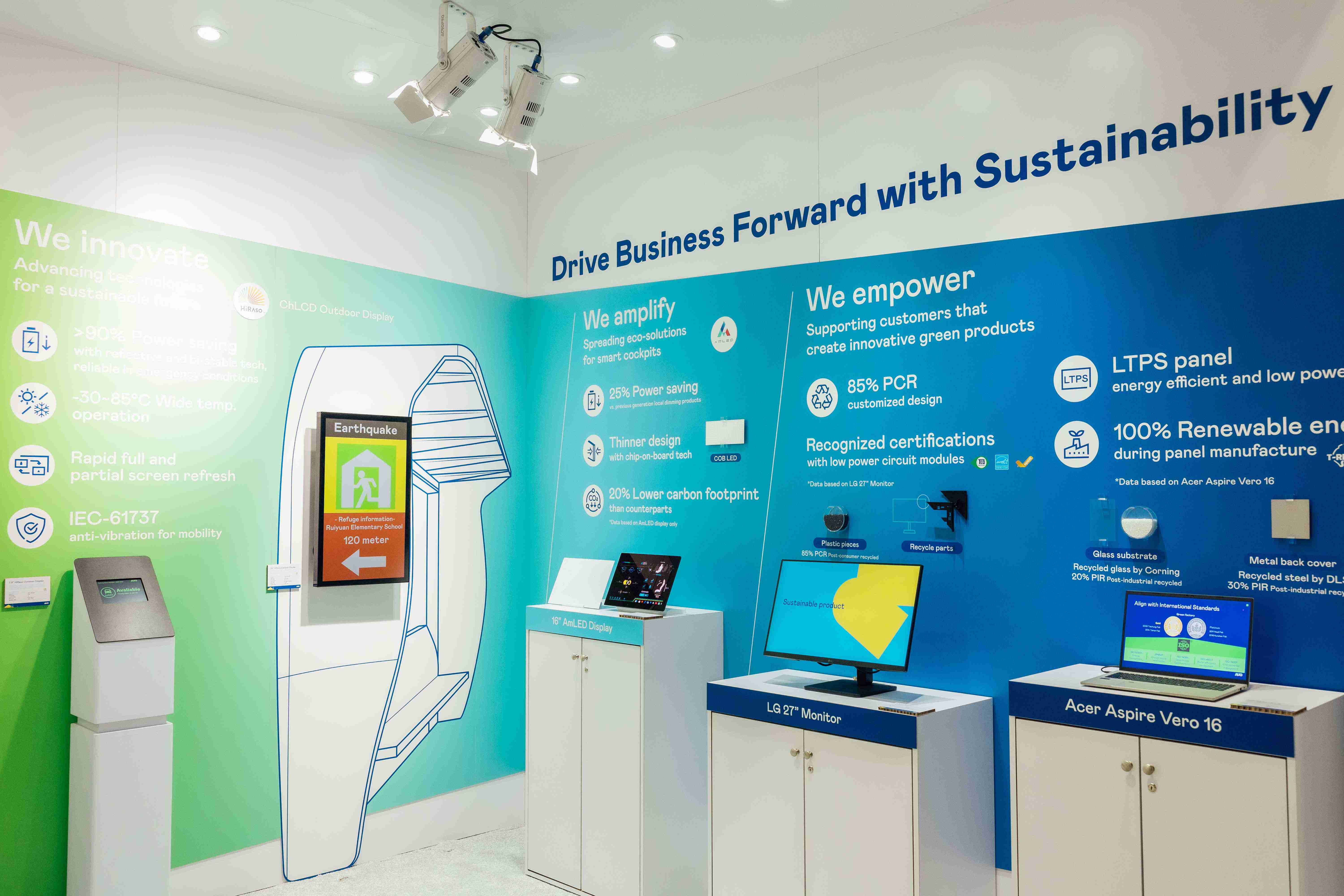 888.BY集团电子游戏运用创新显示技术HiRaso胆固醇液晶双稳态技术达到显示零耗能、、、扩大节能省电的AmLED显示技术应用于车用产品、、、以再生的消费后回收(PCR)塑料及全绿电生产之面板,,,应用于笔电及萤幕,,,增加绿色价值。。。。