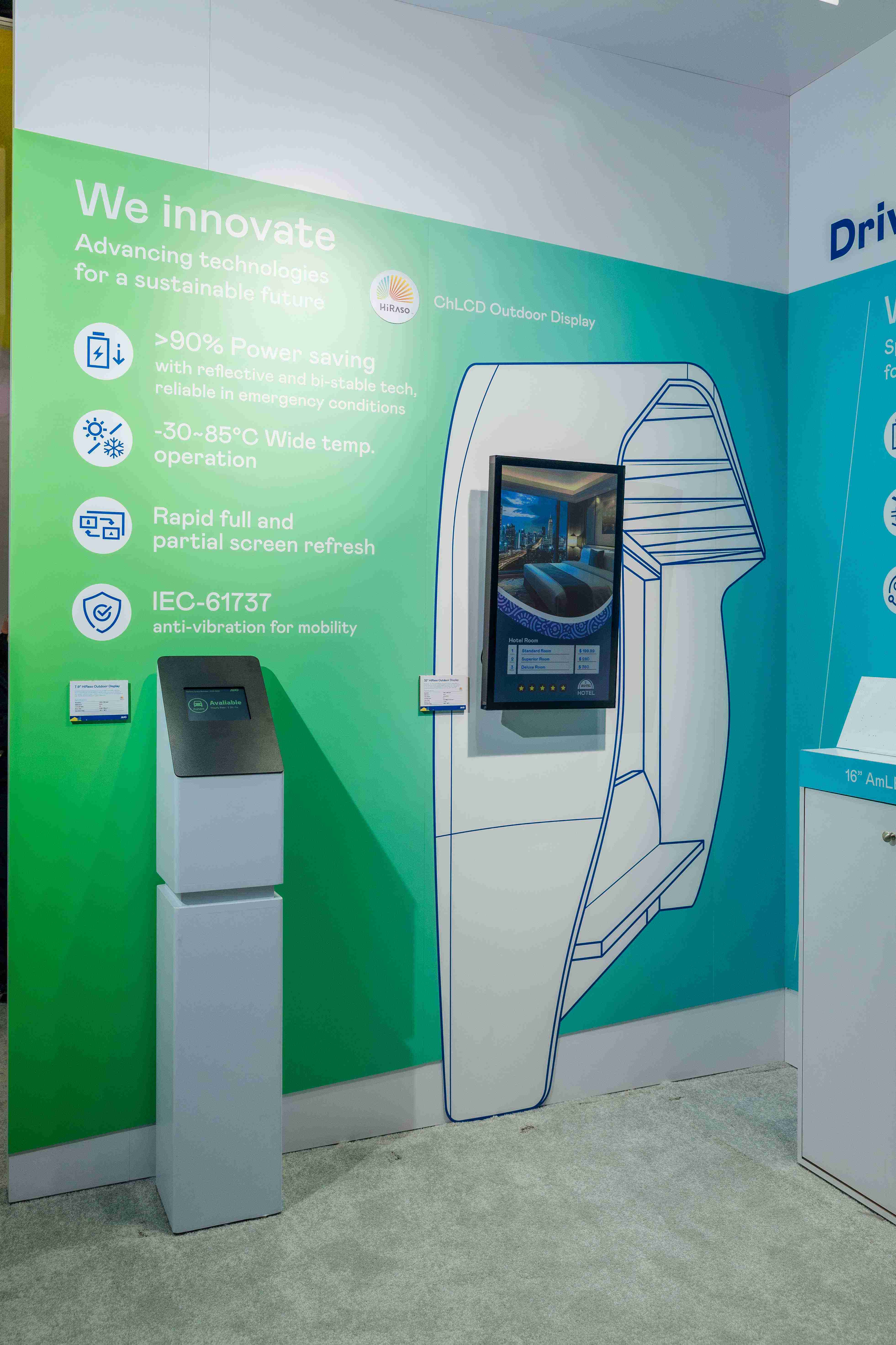 HiRaso胆固醇液晶显示器运用反射环境光线的方式,,,,呈现影像显示时零耗能的环保省电诉求,,,,光线愈强愈能呈现绝佳的色彩饱和度及显示效果,,同时在摄氏-30度至85度间宽温的使用优势,,为户外电子看板的新首选。。